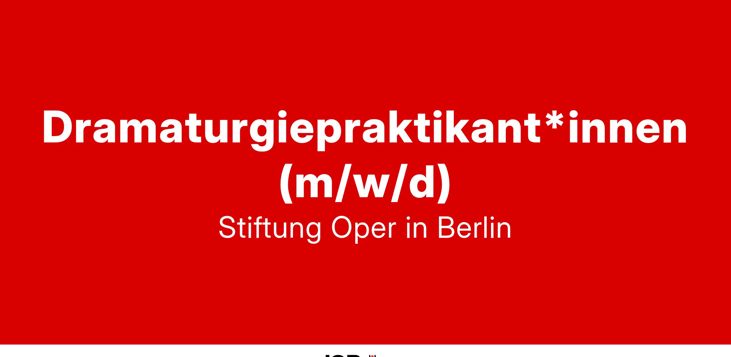 Für die laufende und kommende Spielzeit sucht die Dramaturgie der Deutschen Oper Berlin engagierte Praktikant*innen (m/w/d), die ausbildungs- oder studienbegleitend einen unentgeltlichen Einblick in die Arbeitsprozesse eines großen Opernhauses und das Tätigkeitsfeld der Dramaturgie erhalten möchten. Insbesondere freuen wir uns über Bewerbungen von Studierenden der Musik-, Theater- und Geisteswissenschaften. Erste Erfahrungen im Bereich Musiktheater sind von Vorteil. Wir empfehlen, sich im Vorfeld der Bewerbung einen Überblick über die kommenden Neuproduktionen an der Deutschen Oper Berlin zu verschaffen.