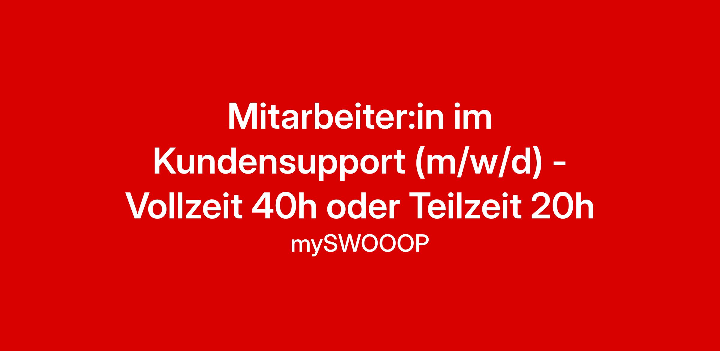 UNSER ANGEBOT Purpose – Wir bieten dir eine abwechslungsreiche Tätigkeit in unserem groß gewordenem Start-Up und einen Job mit Sinn der wirklich einen Unterschied macht Work-Life-Balance – Wir schätzen Deine Zeit und sollte es mal zu Überstunden kommen, bezahlen wir dir diese selbstverständlich. Take care – Als Teil von mySWOOOP erhältst Du eine betriebliche Altersvorsorge Freiraum – Wir schaffen dir Raum für Deine Weiterentwicklung und unterstützen dich dabei Treat yourself – Bei uns findest Du verschiedene Corporate Benefits und Mitarbeiter-Rabatte auf all unsere Produkte