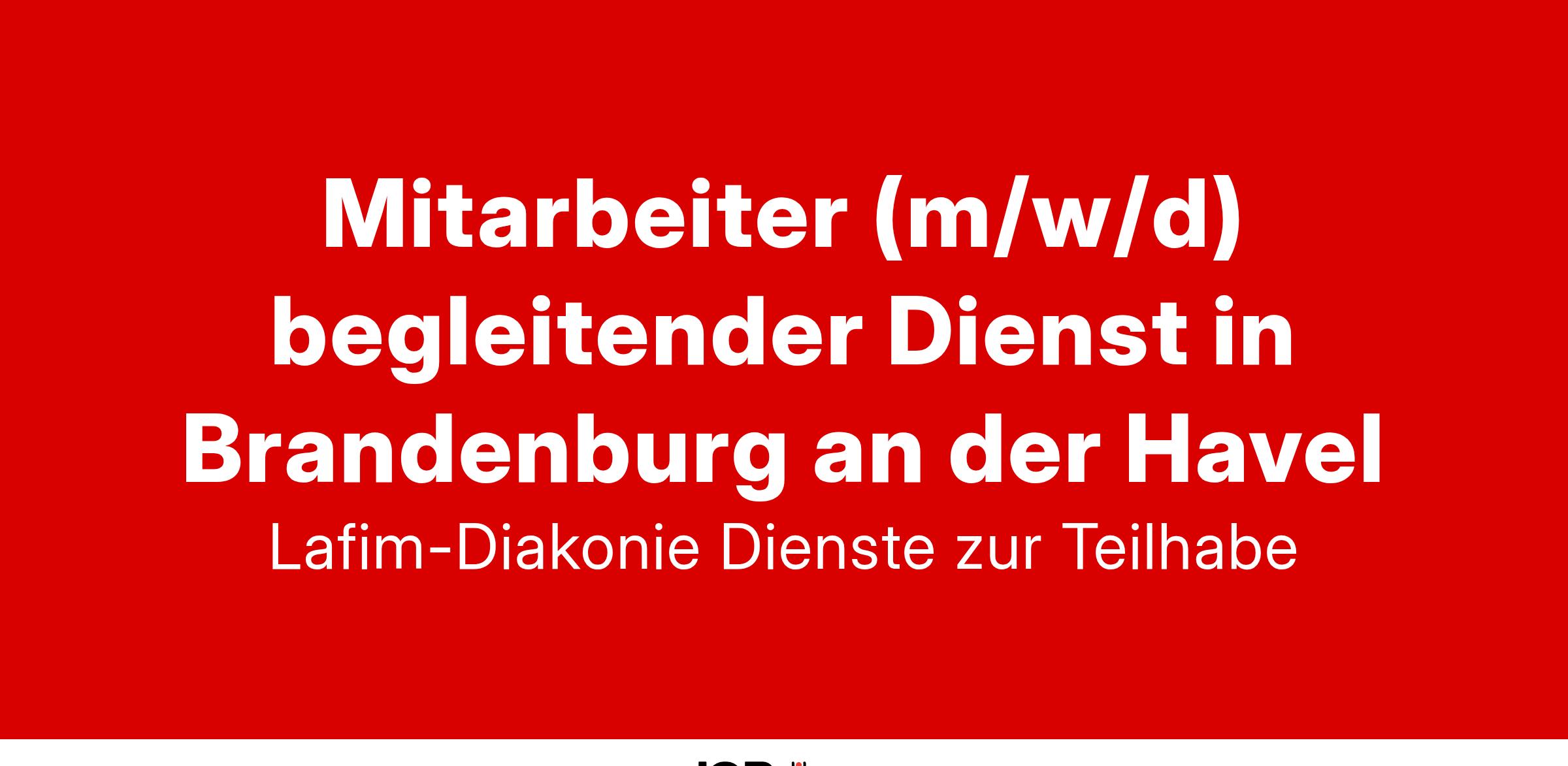 Für die Lafim-Diakonie Dienste zur Teilhabe, Belziger Chaussee 6 in 14776 Brandenburg an der Havel, suchen wir Sie als Mitarbeiter (m/w/d) für den Begleitenden Dienst Wohnen zum nächstmöglichen Zeitpunkt in Teilzeit (30 Stunden/Woche). Ihre Einsatzorte liegen hauptsächlich in Brandenburg an der Havel und Umgebung.