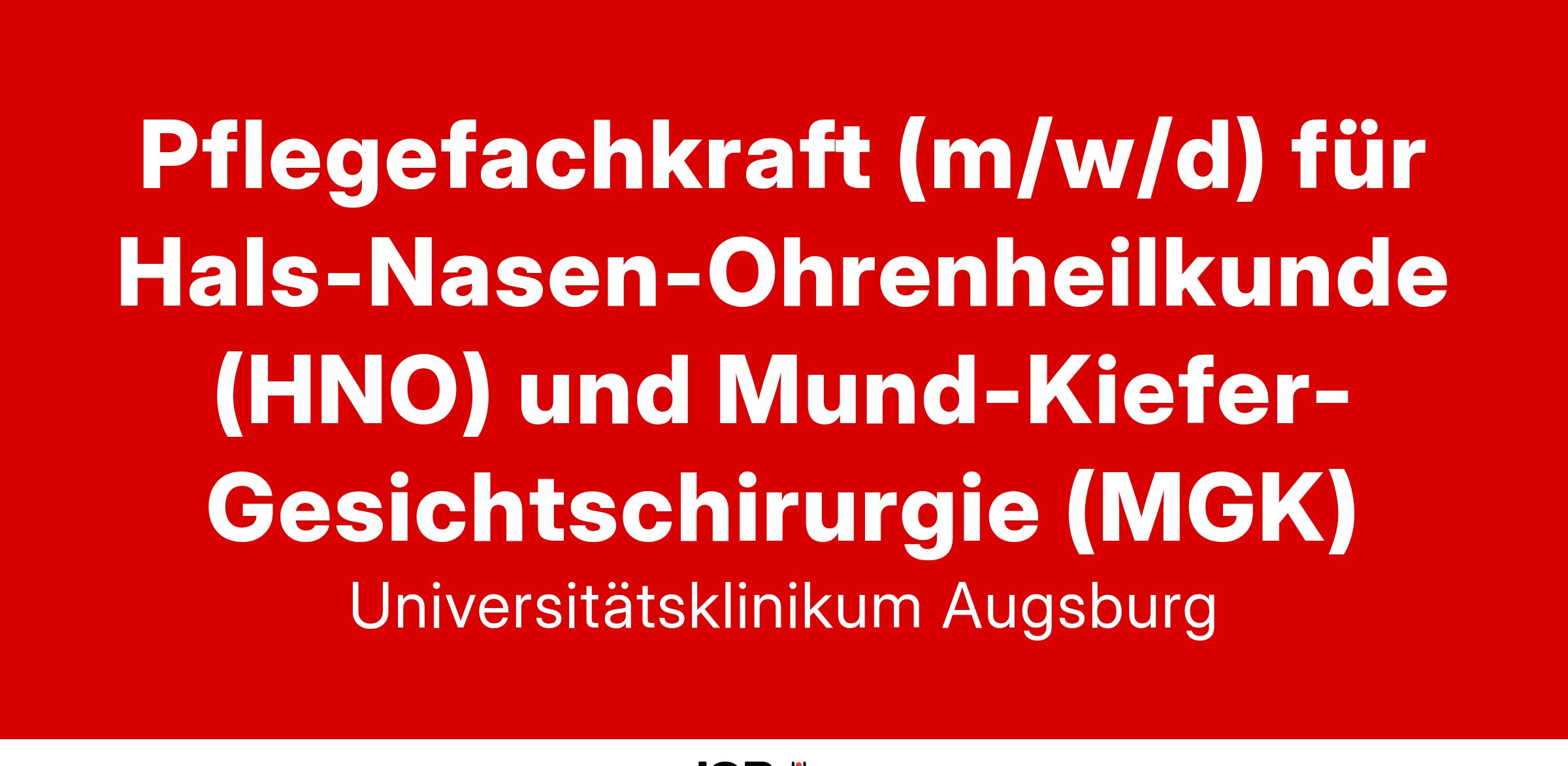 Du bist Pflegefachperson oder Gesundheits- und Krankenpfleger (m/w/d) und interessierst Dich für die Arbeit der Normalstation für Hals-Nasen-Ohrenheilkunde (HNO) und Mund-Kiefer-Gesichtschirurgie (MGK) am Medizincampus Süd im Stadtteil Haunstetten auf höchstem Niveau?